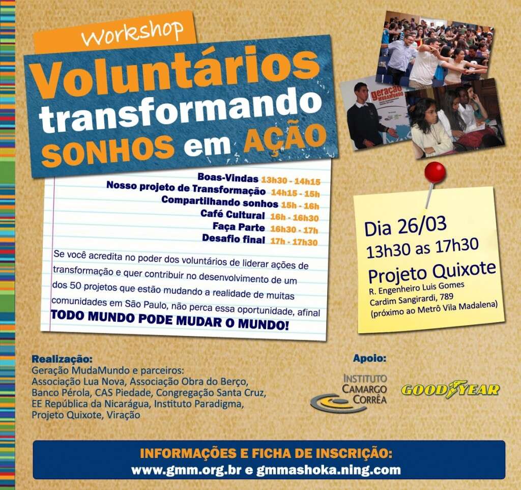 Preparando a Semana Global do Voluntariado Jovem, que acontece no próximo mês, o Workshop é uma estratégia de intervenção criada pelo Programa Geração MudaMundo da Ashoka em parceria com Instituto Camargo Corrêa, Goodyear e organizações sociais de São Paulo.