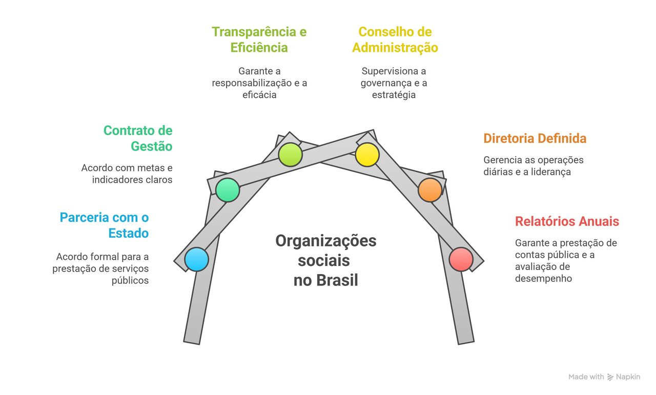 Uma organização social se caracteriza por ser uma instituição privada, sem fins lucrativos, que atua em parceria formal com o Estado para executar serviços públicos.